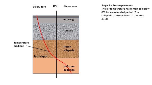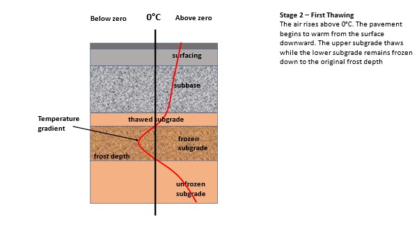 In a sudden spring thaw, as air temperatures rise above zero, the temperature within the pavement begins to rise, commencing from the surface. A temperature gradient develops through the pavement, extending into the frozen subgrade. As the ice melts in the upper zone of the subgrade, the soil immediately below is still frozen and impermeable, water is trapped in the thawed soil layer. The saturated subgrade layer is substantially weakened and its bearing capacity reduced. At this point, the pavement is highly susceptible to damage from traffic loading.
