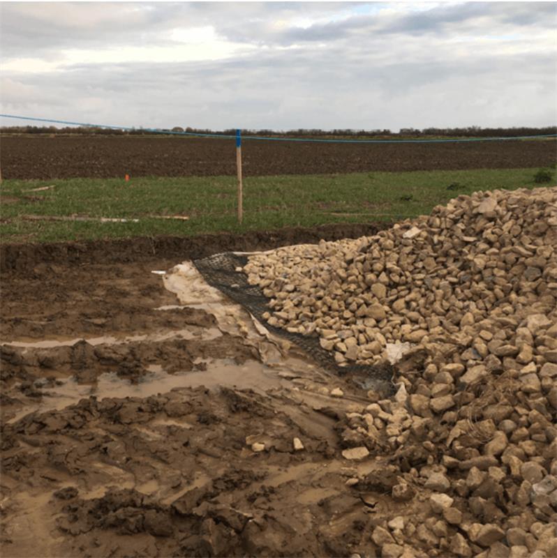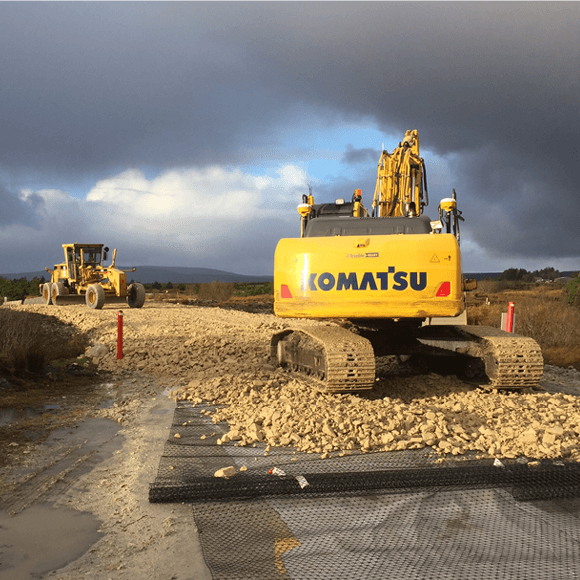 Upon review of the original design proposal, Tensar provided a value engineered solution that maximised the performance of the working platforms and access roads mechanically stabilised by Tensar geogrids. Working platform thickness was reduced by 40% to 50% (depending on ground conditions) while still meeting the loading requirements. The volume of aggregate required was reduced by over 50%, leading to major reductions in CO2 emissions. Key to achieving this figure was the reduction in aggregate truck movements, which for this project was around 550 vehicles. By removing a substantial volume of traffic from rural roads, not only did Tensar contribute towards an environmental solution, but also promoted health and safety benefits.