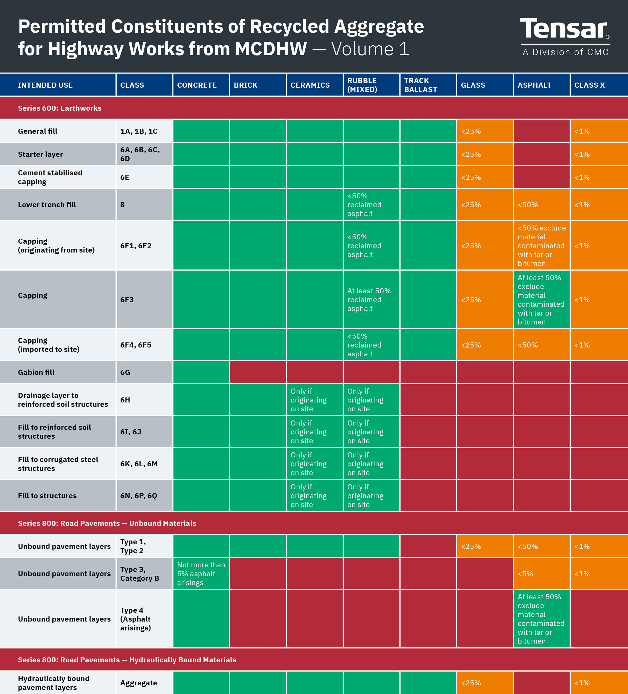 The earthworks specification (series 600) classifies materials for specific uses. Recycled aggregates are acceptable in all classifications, although the allowable source varies by Class. The permitted constituents can be seen in Table 1 below.