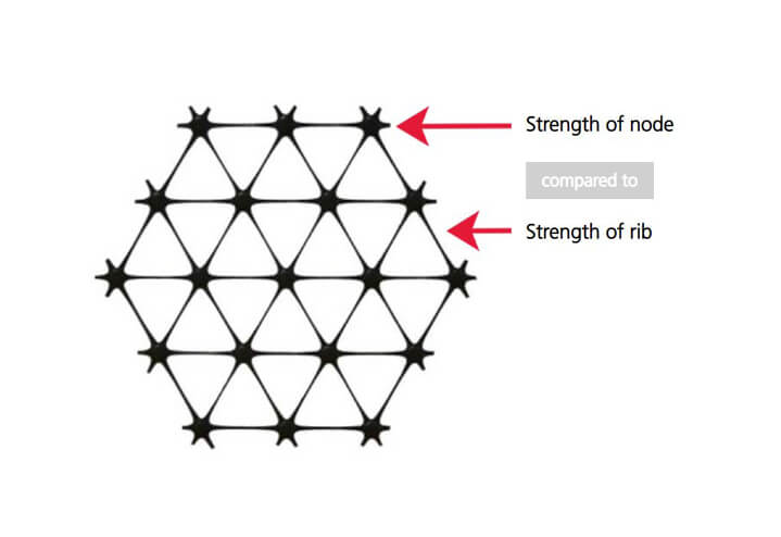 The physical property of geogrids known as junction efficiency is the measure of the strength of the node compared to the strength of the rib, expressed as a percentage and indicates the ability of the geogrid to transfer loads from one rib to other ribs in different directions: