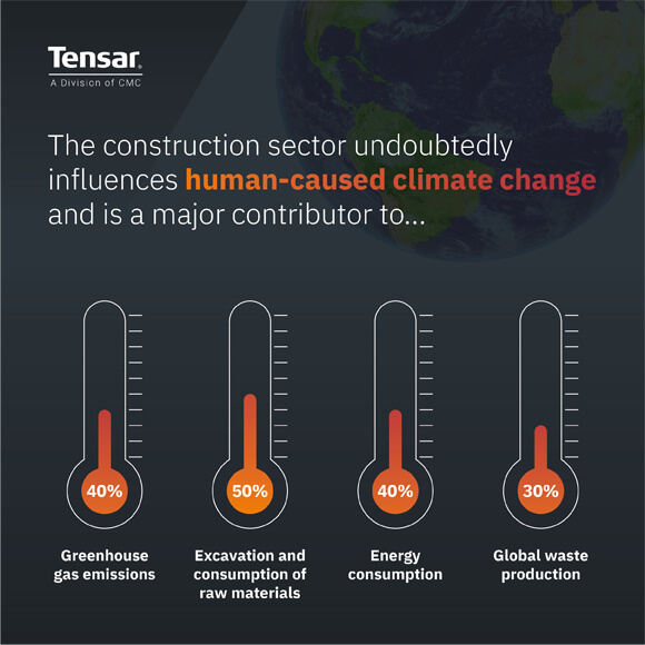 There are several ways in which geosynthetic solutions can be incorporated into structures to reduce the impact on the environment both during construction and lifespan.