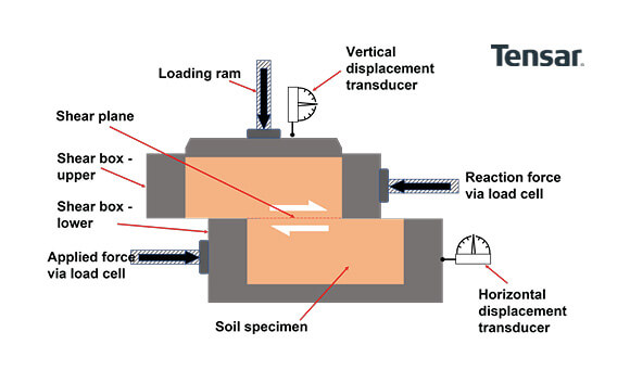 A relatively simple test that can be performed on undisturbed or remoulded samples. The purpose of a shear test is to determine how rocks or soils will respond to shear stress (that is, a parallel force applied to the material). From this type of test, we can work out the shear strength of soil – its resistance to deformation by tangential (or shear) stress. The sample is placed in a shear box and subjected to a vertical pressure. The upper section of the shear box can be moved relative to the bottom, shearing the sample at the interface. The force needed to do this is measured and from this the shear strength can be calculated.