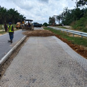 Jabatan Kerja Raya (JKR) Rompin needed to rehabilitate a severely deteriorated district road with limited funding and no immediate drainage upgrade. The challenge was to deliver a long-lasting solution that could be implemented quickly and cost-effectively, while overcoming variable subgrade conditions.