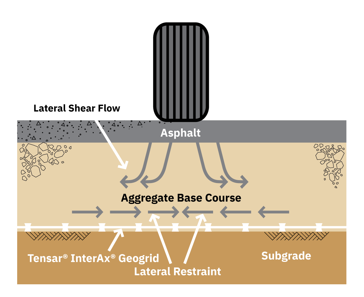 Many assume that geotexiles are a great solution to stop rutting in roadways because they equate high tensile strength with better in-ground performance. However, multiple full-scale, highly controlled tests conducted over the years have proven that soil tensile strength is not an indicator of performance. Stabilization geogrid like Tensar InterAx has apertures that allow granular materials to interlock. This interlock confines the granular particles to keep them from spreading laterally and minimizes the movement of the material. This also means you can get the same level or better performance using less aggregate.