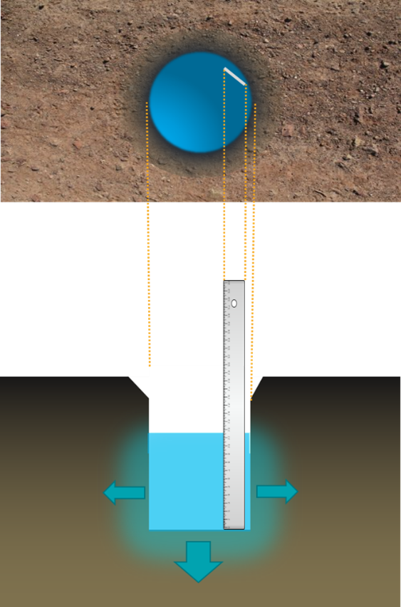 Simple Field Percolation Test – measuring the rate of drop in water level in an accurately sized hole enables calculation of saturated soil conductivity, an indicator of soil permeability.