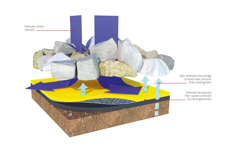 Rainwater is unable to penetrate the micro-porous filter and is drained laterally to the side of the track while pore water below the Tracktex is relieved upwards under cyclic loading which aids residual slurry to dry out as the pore water is dissipated. It can effectively facilitate the passage of liquid under pressure, but the pores block clay fines from coming through. Without pressure, water cannot pass through the filter, so that any underlying clay formation will, over time, dry out and have an improved modulus.